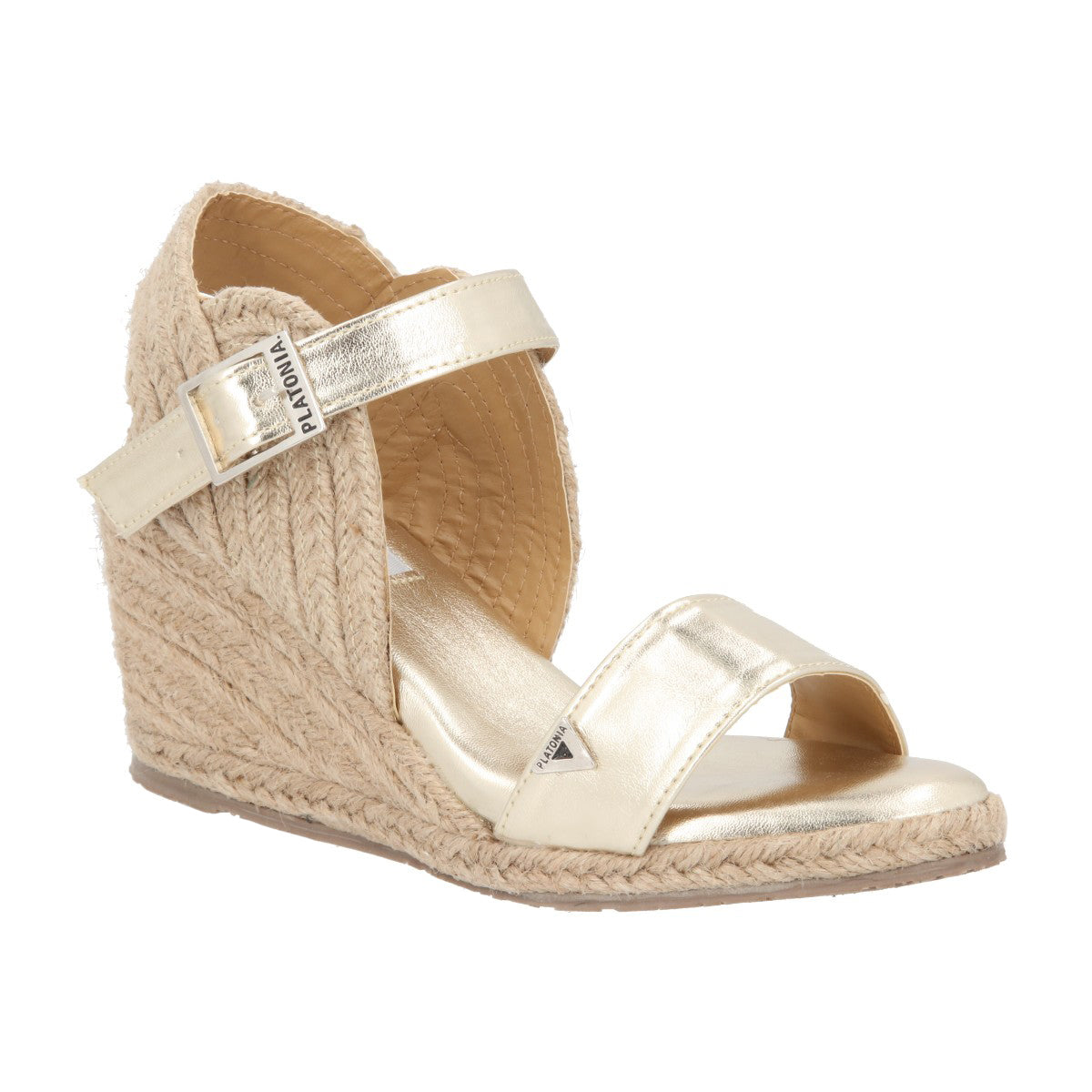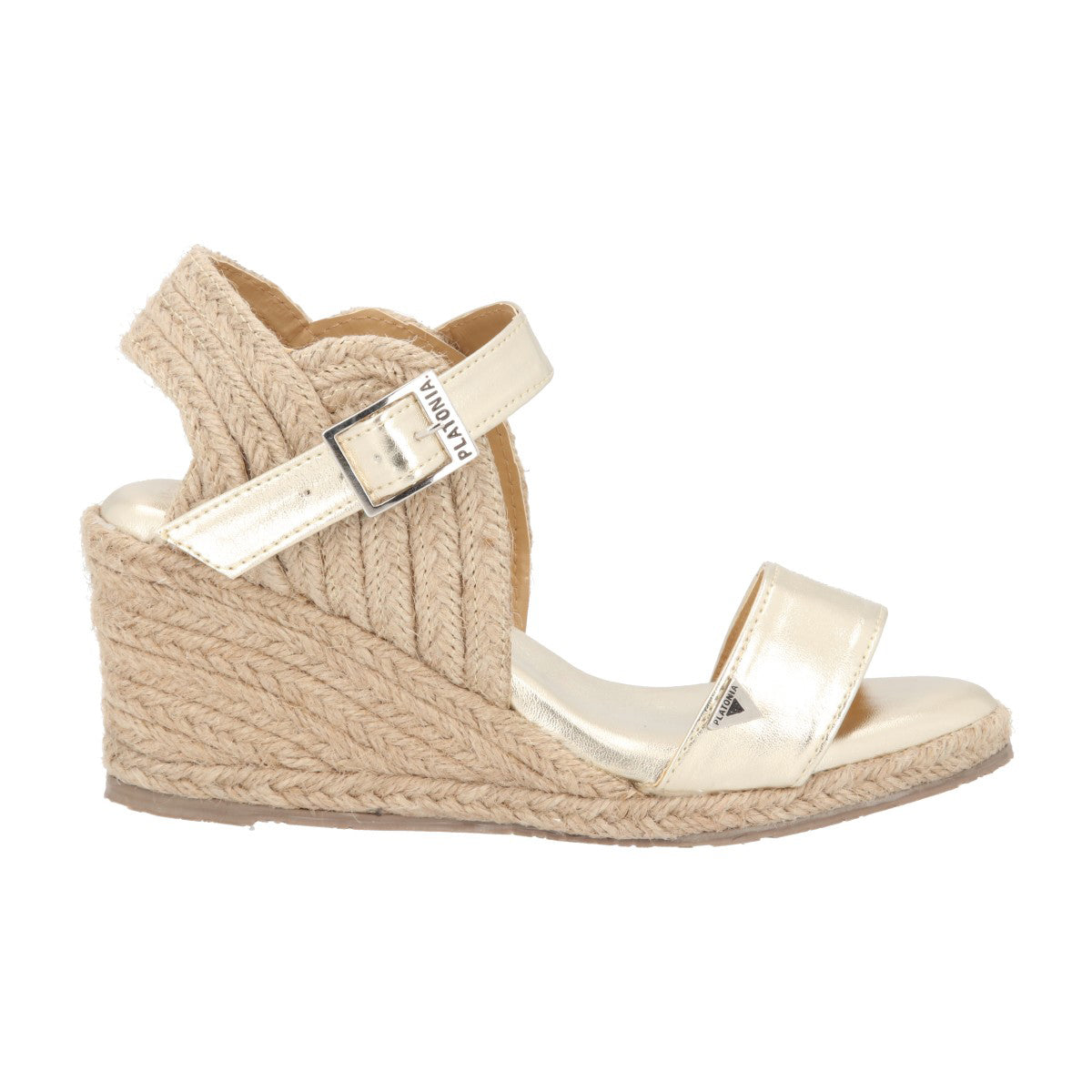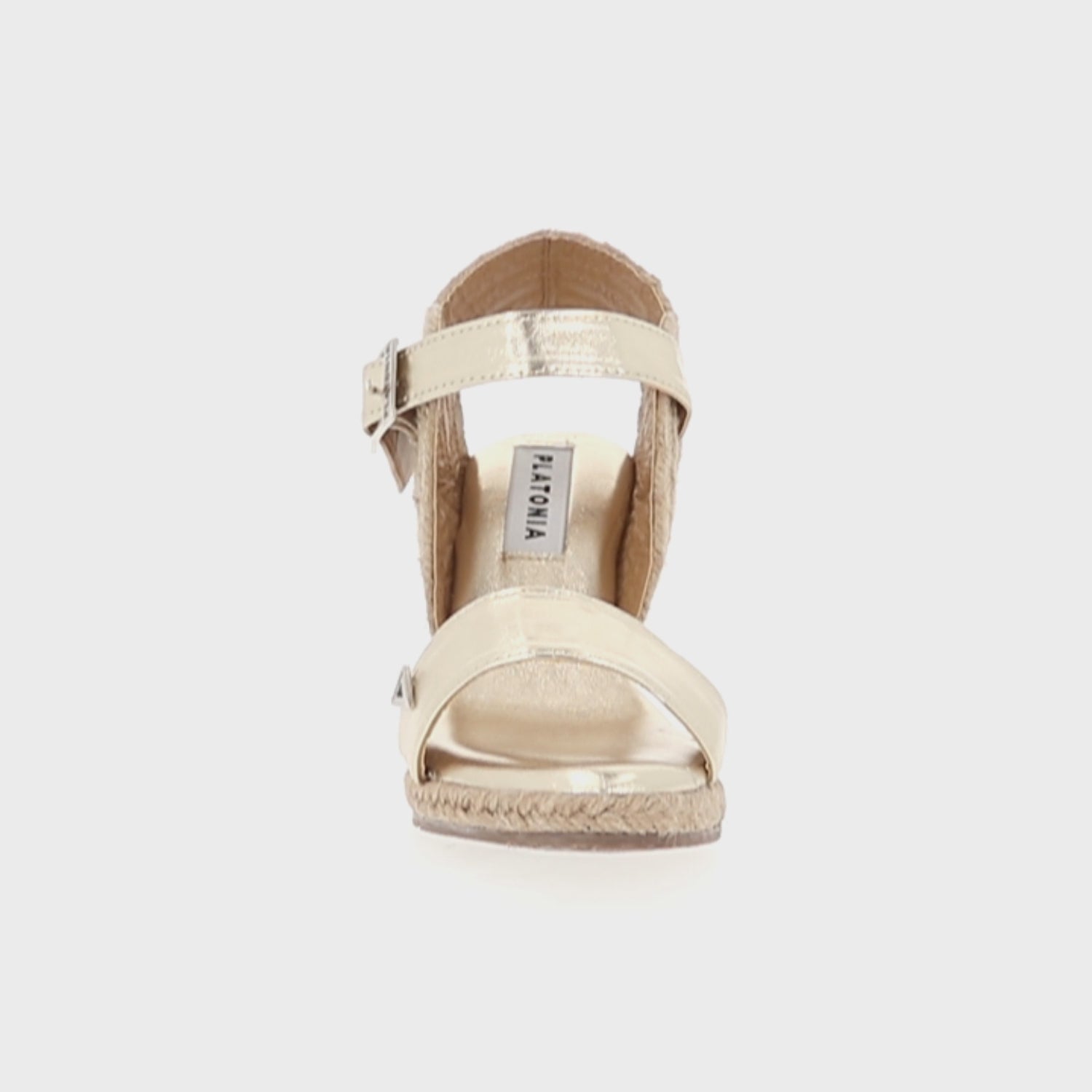 Sandalia de plataforma ultra confort con yute napa metálica oro para mujer con látigo ajustable estándar.