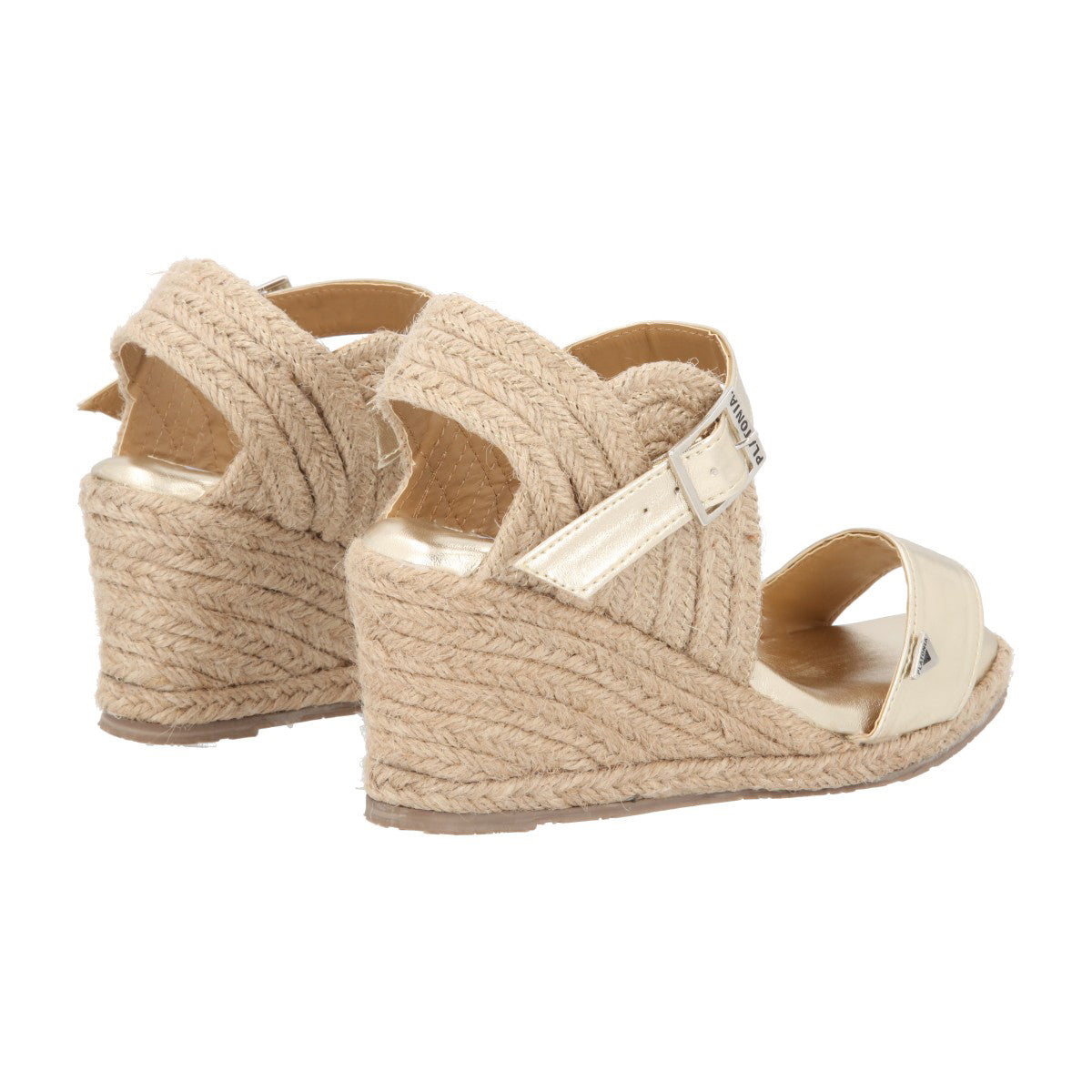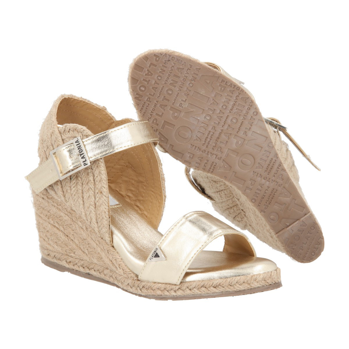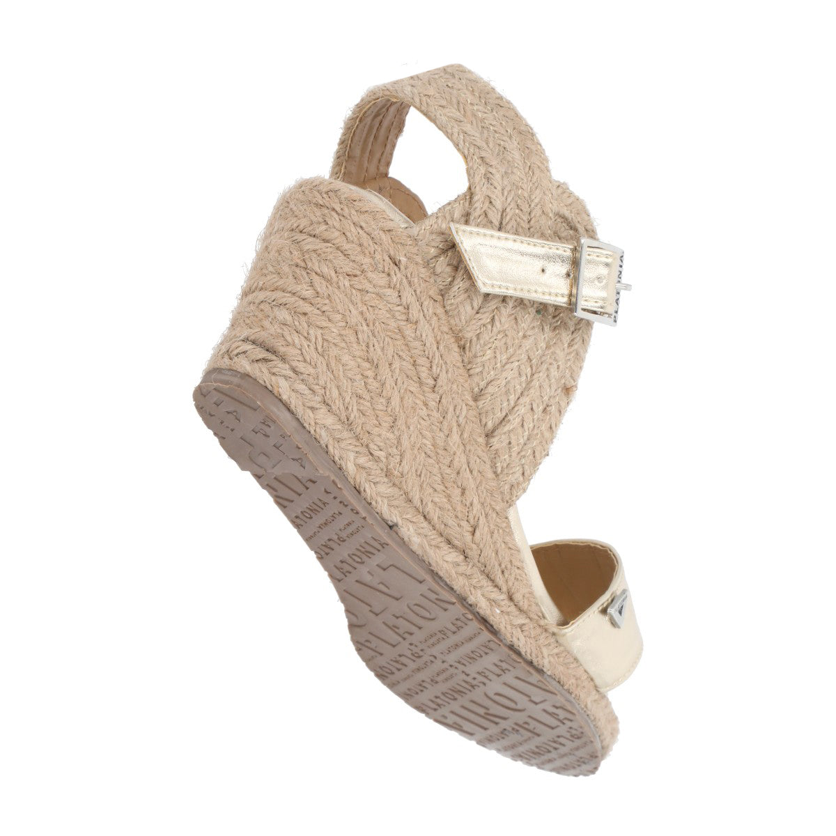 Sandalia de plataforma ultra confort con yute napa metálica oro para mujer con látigo ajustable estándar.