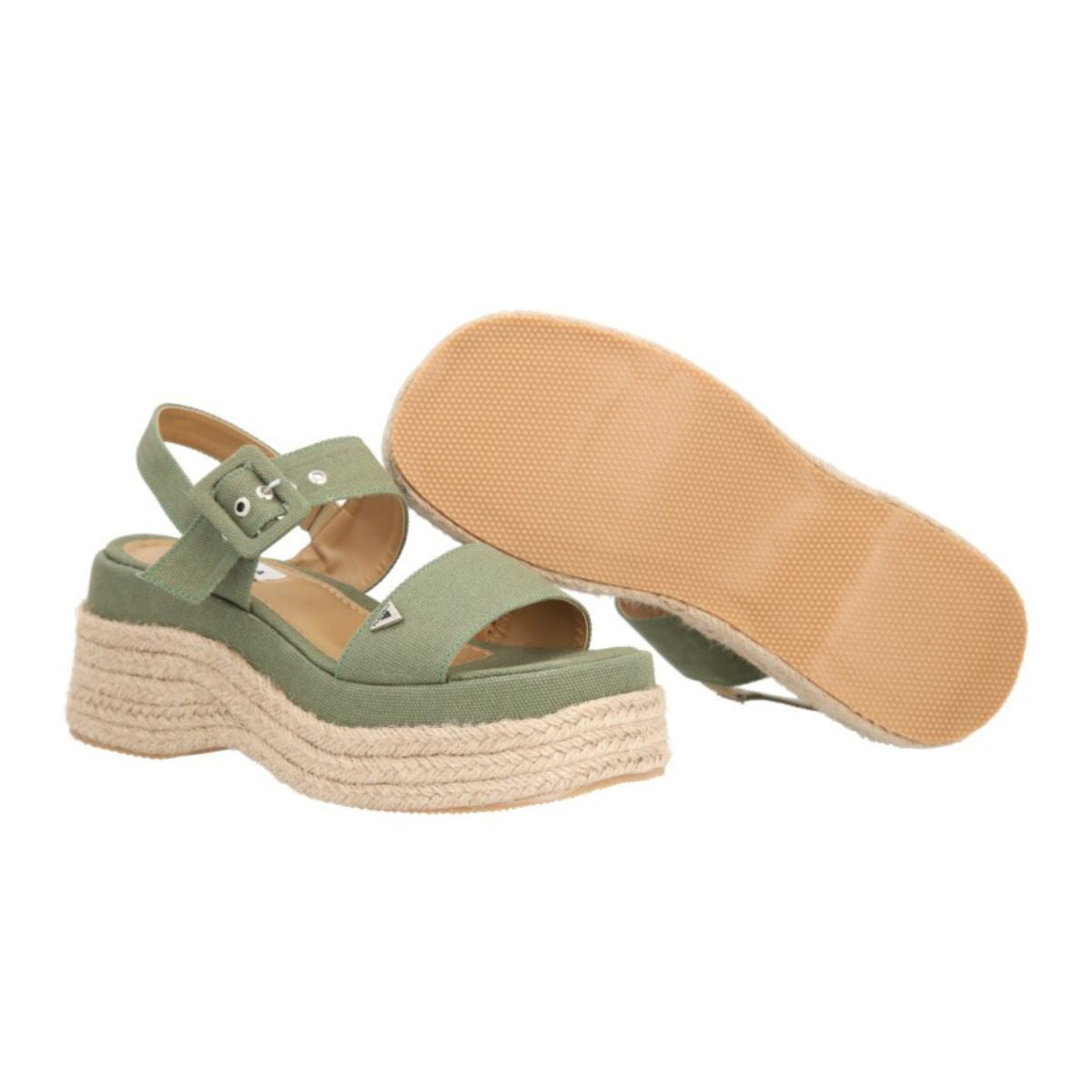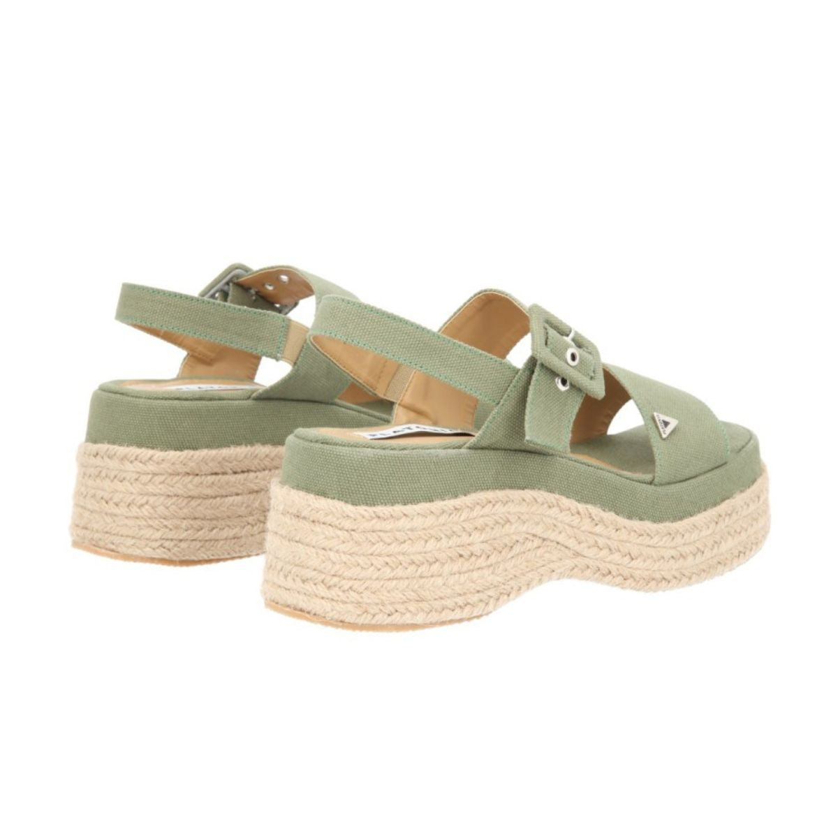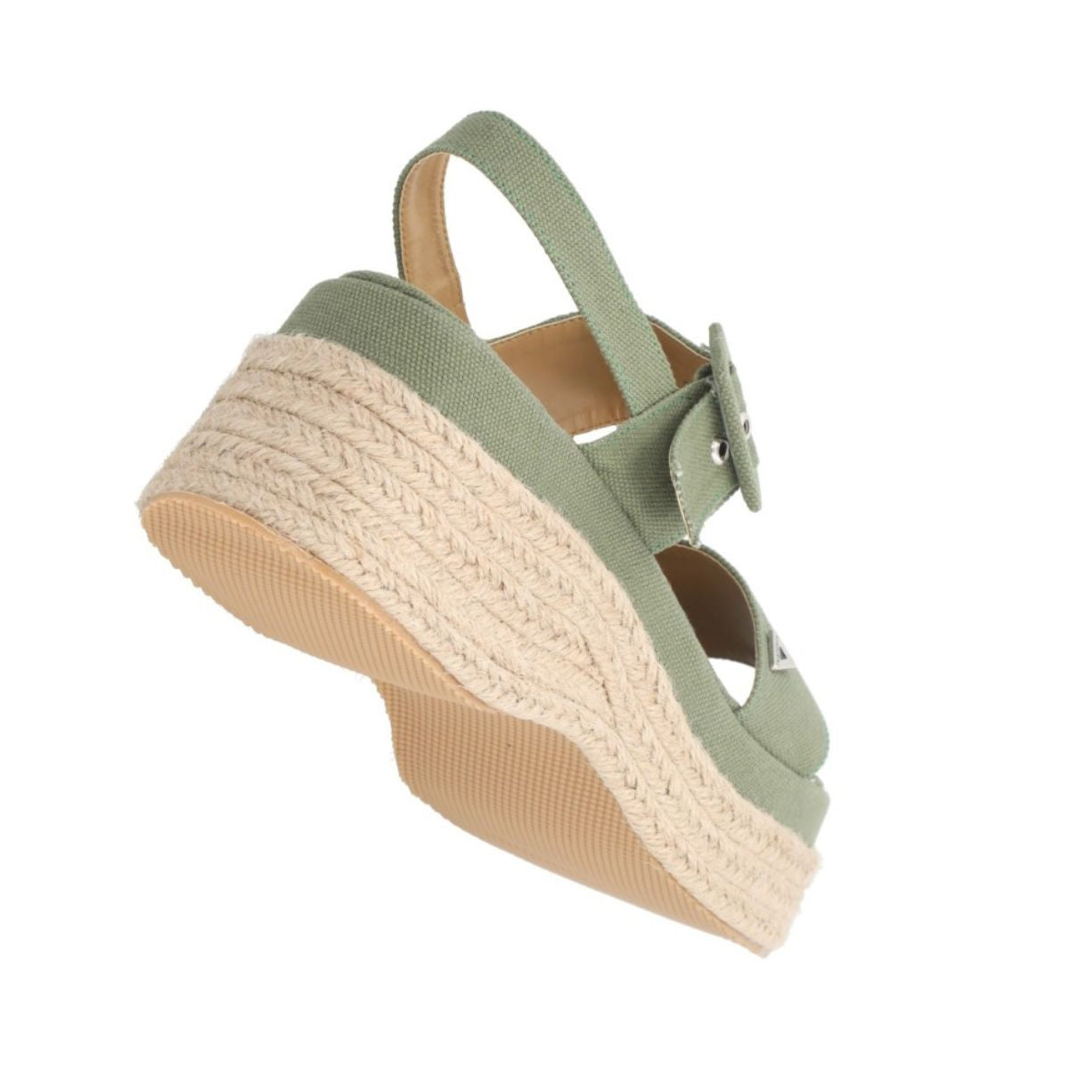 Sandalia de plataforma Valencia con yute natural y lona curry premium verde selva para mujer con látigo ajustable. Sandalia de plataforma chunky.