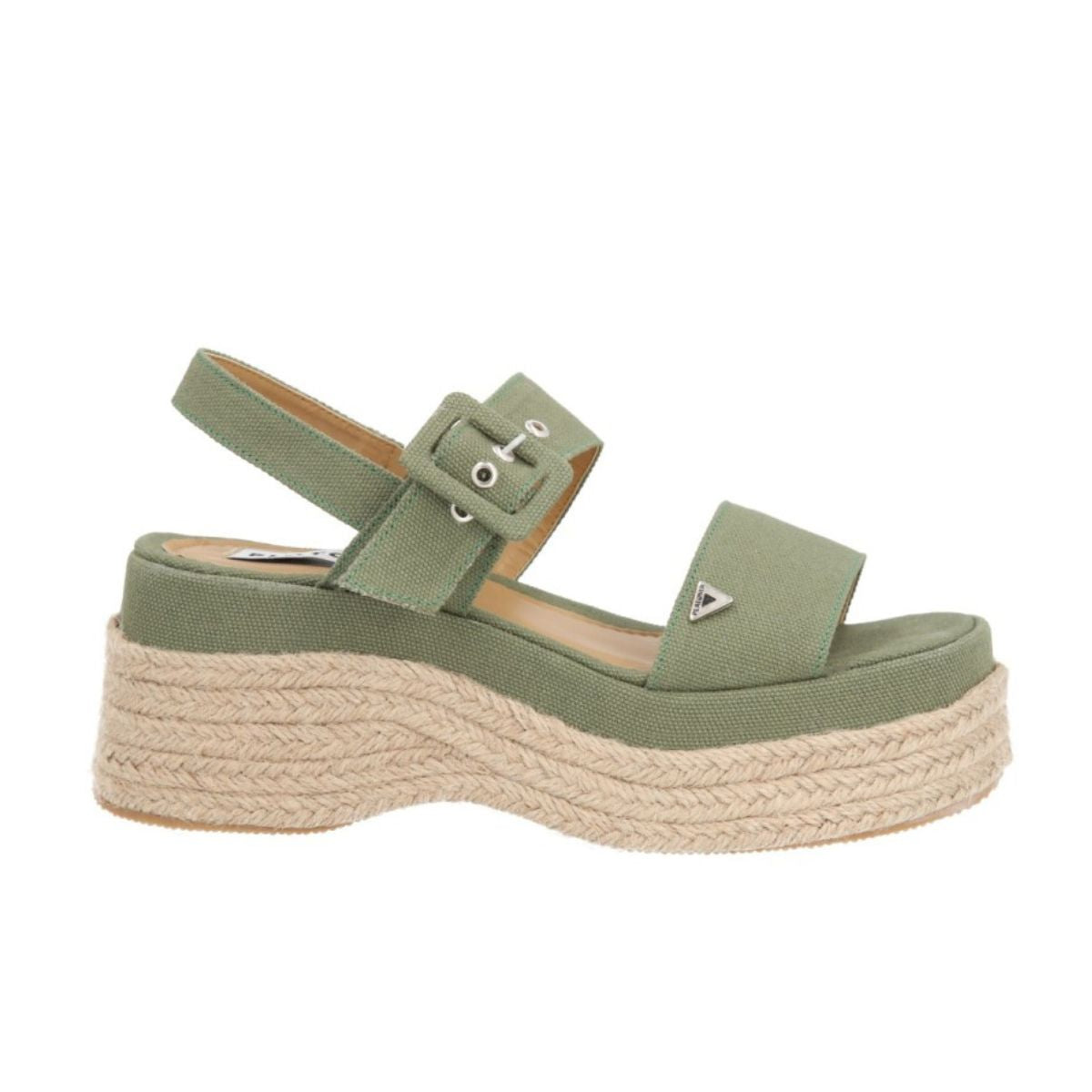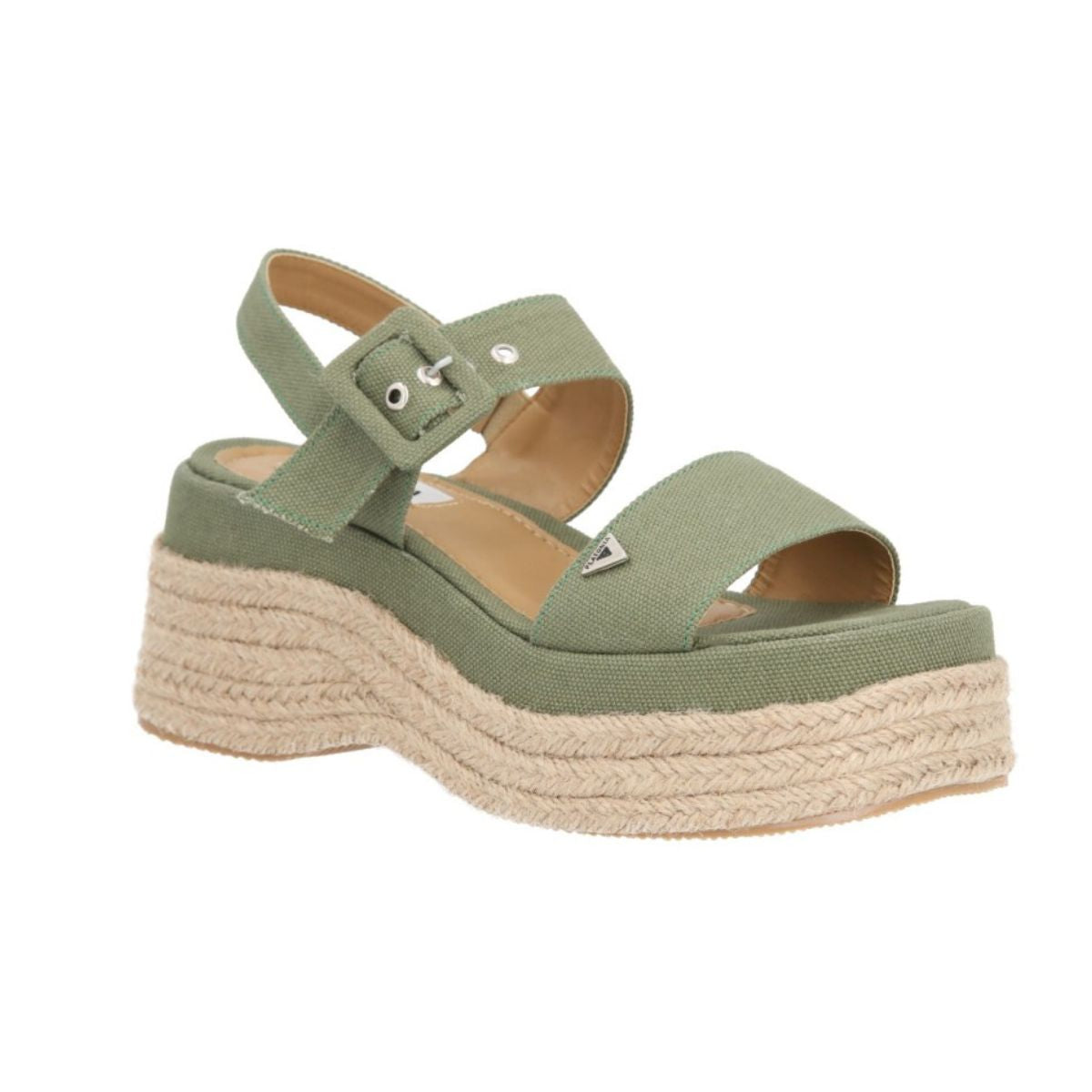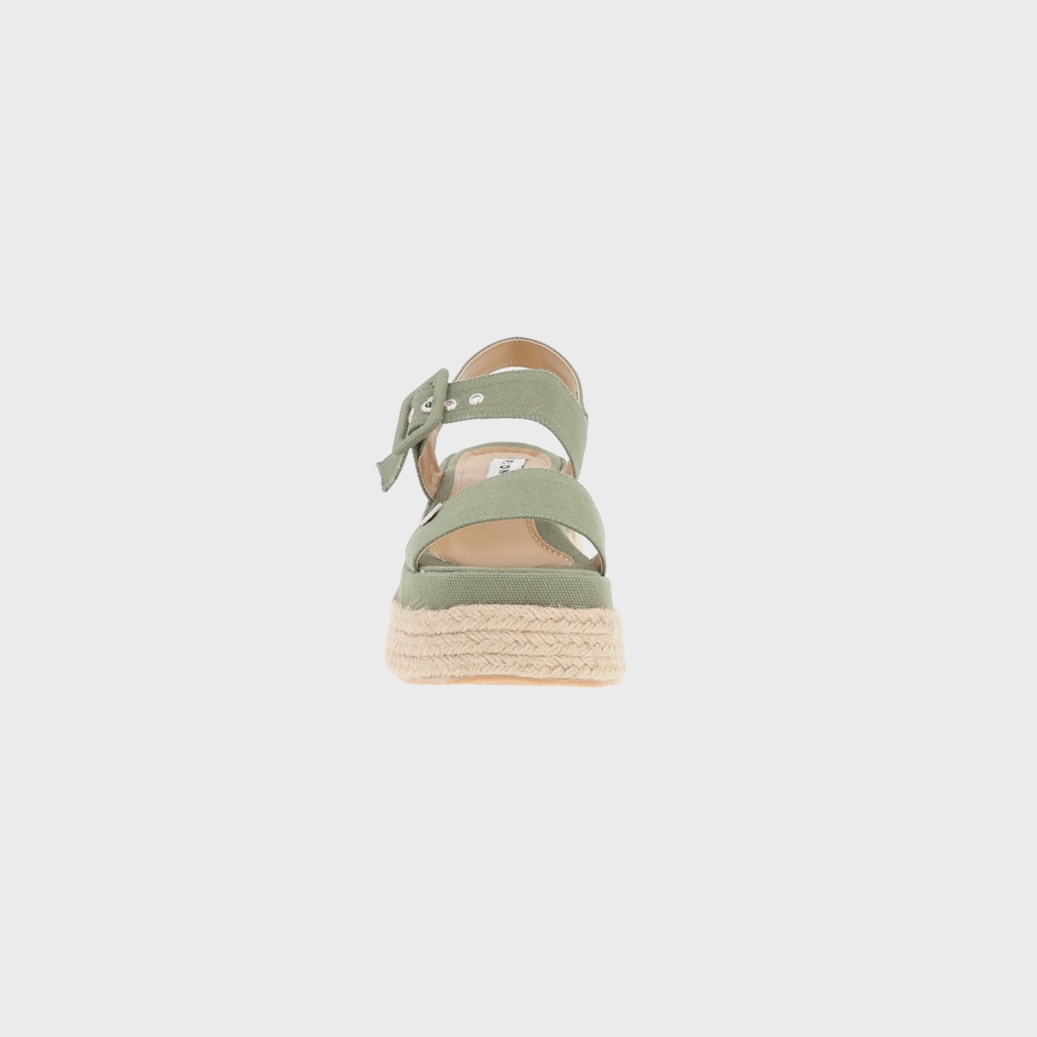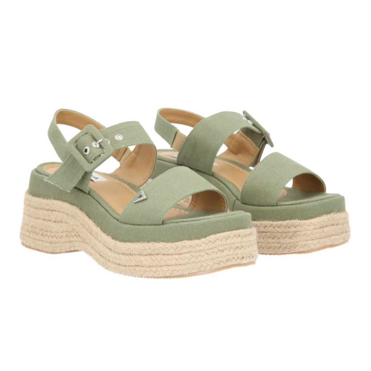 Sandalia de plataforma Valencia con yute natural y lona curry premium verde selva para mujer con látigo ajustable. Sandalia de plataforma chunky.