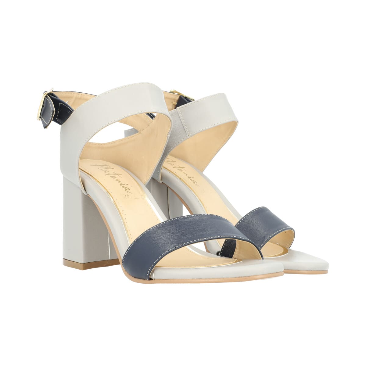 Zapatilla de tacón para mujer color gris con azul marino con ajuste en tobillo de látigo