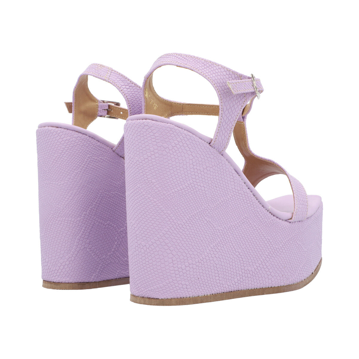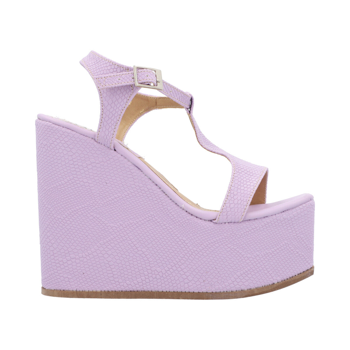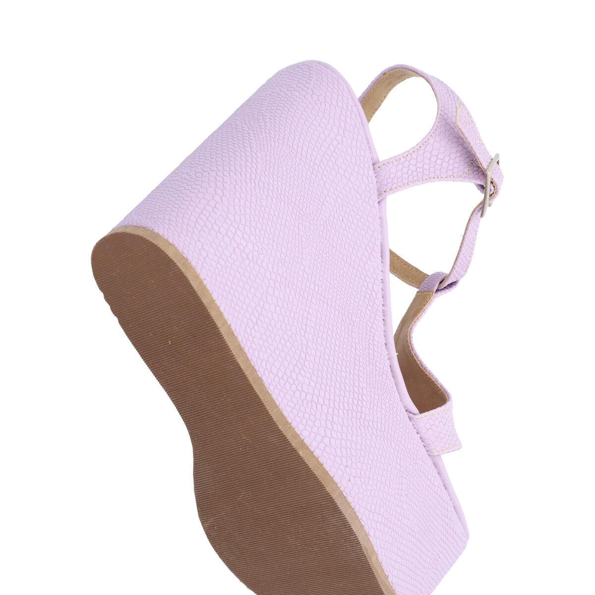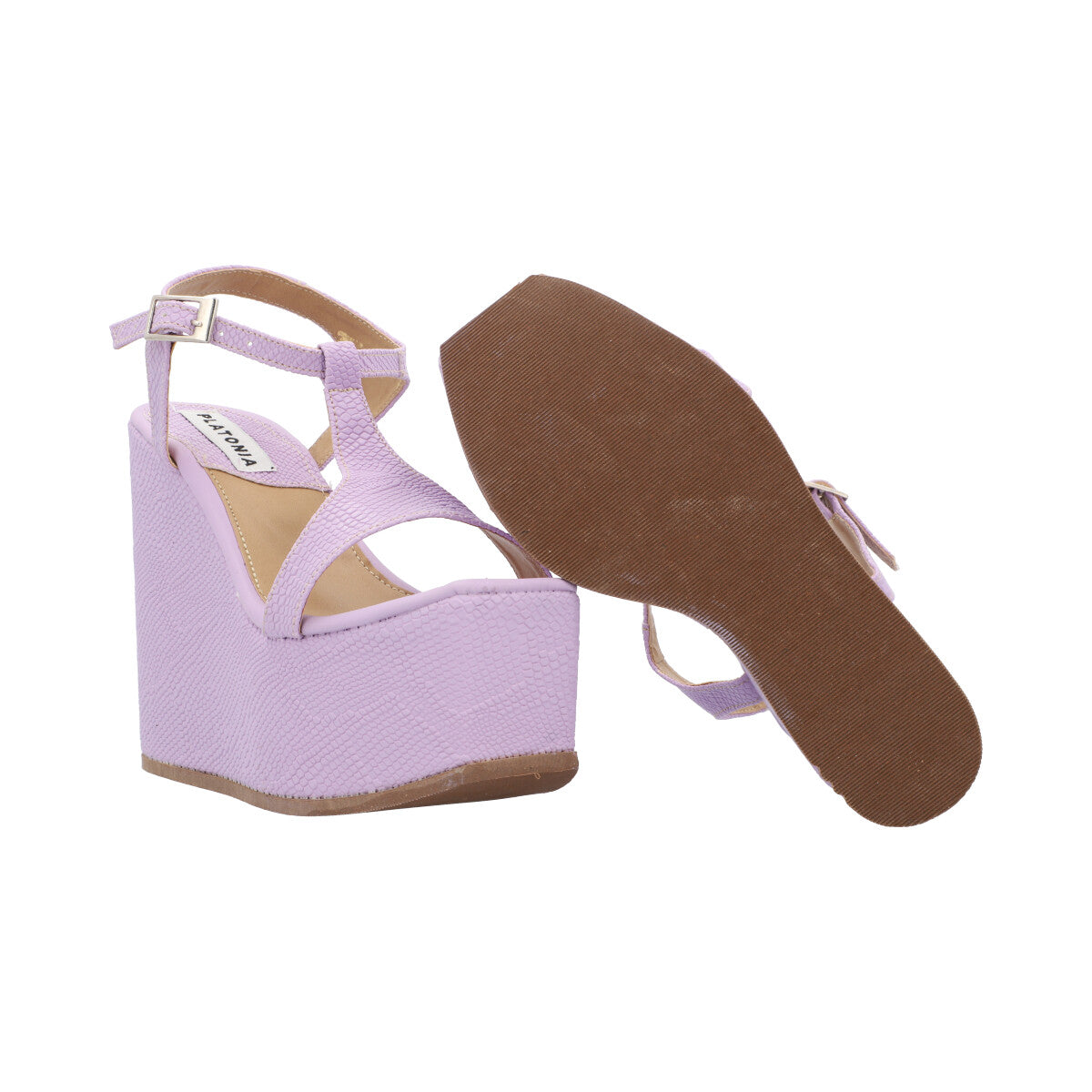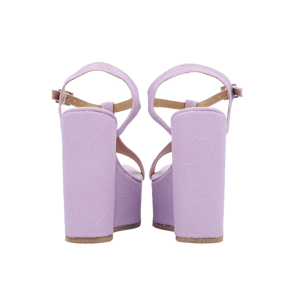 Sandalia de plataforma cuadrada trendy para mujer color serpentus lila con hebilla ajustable.