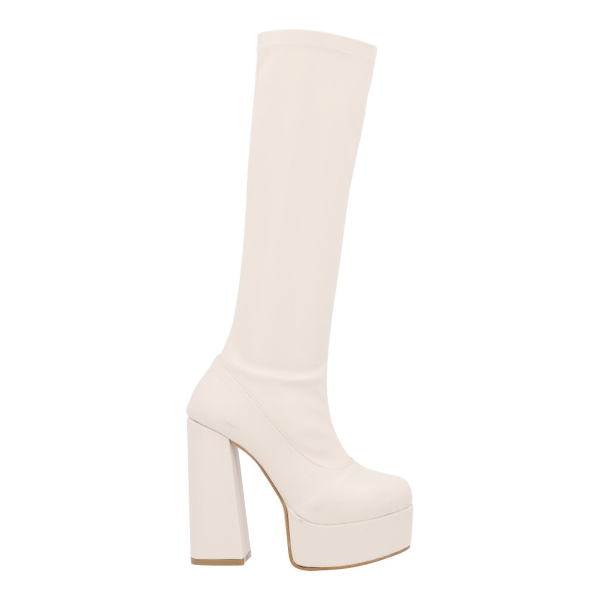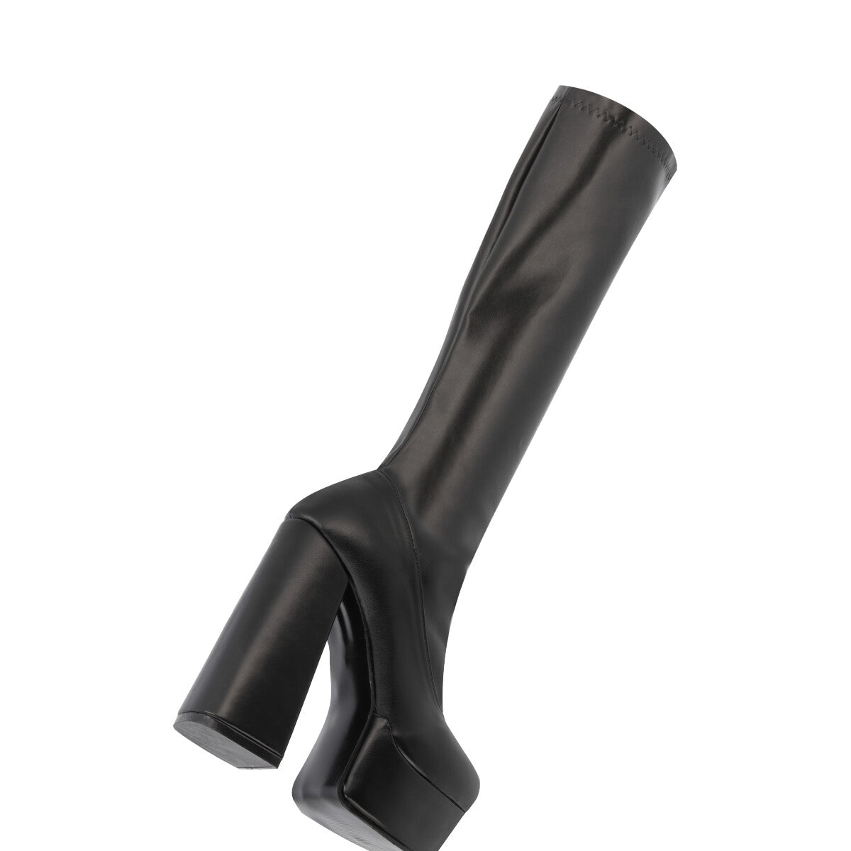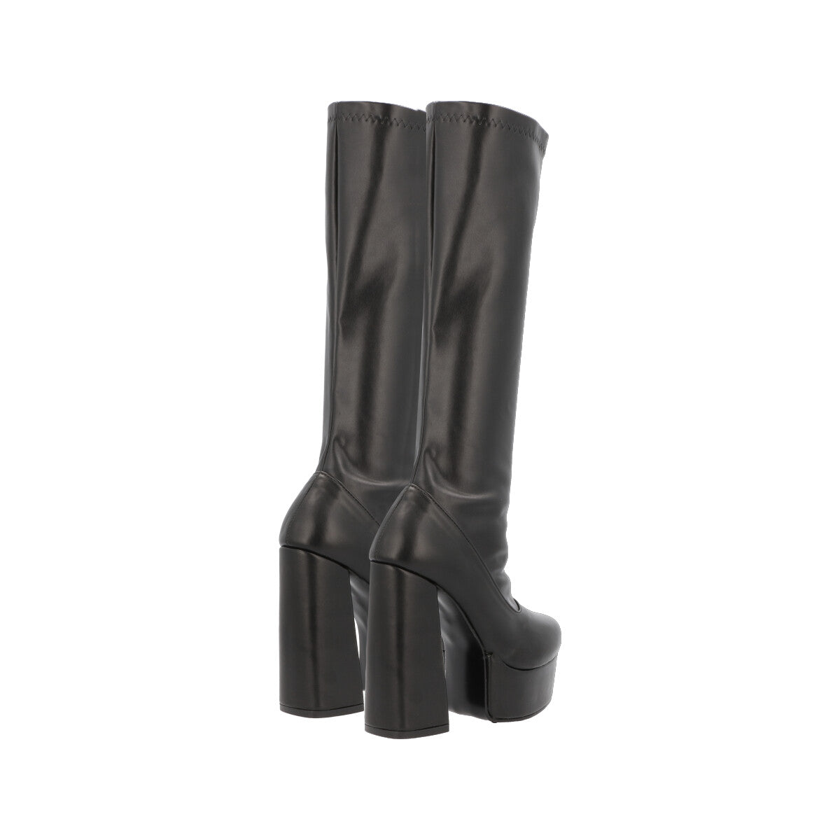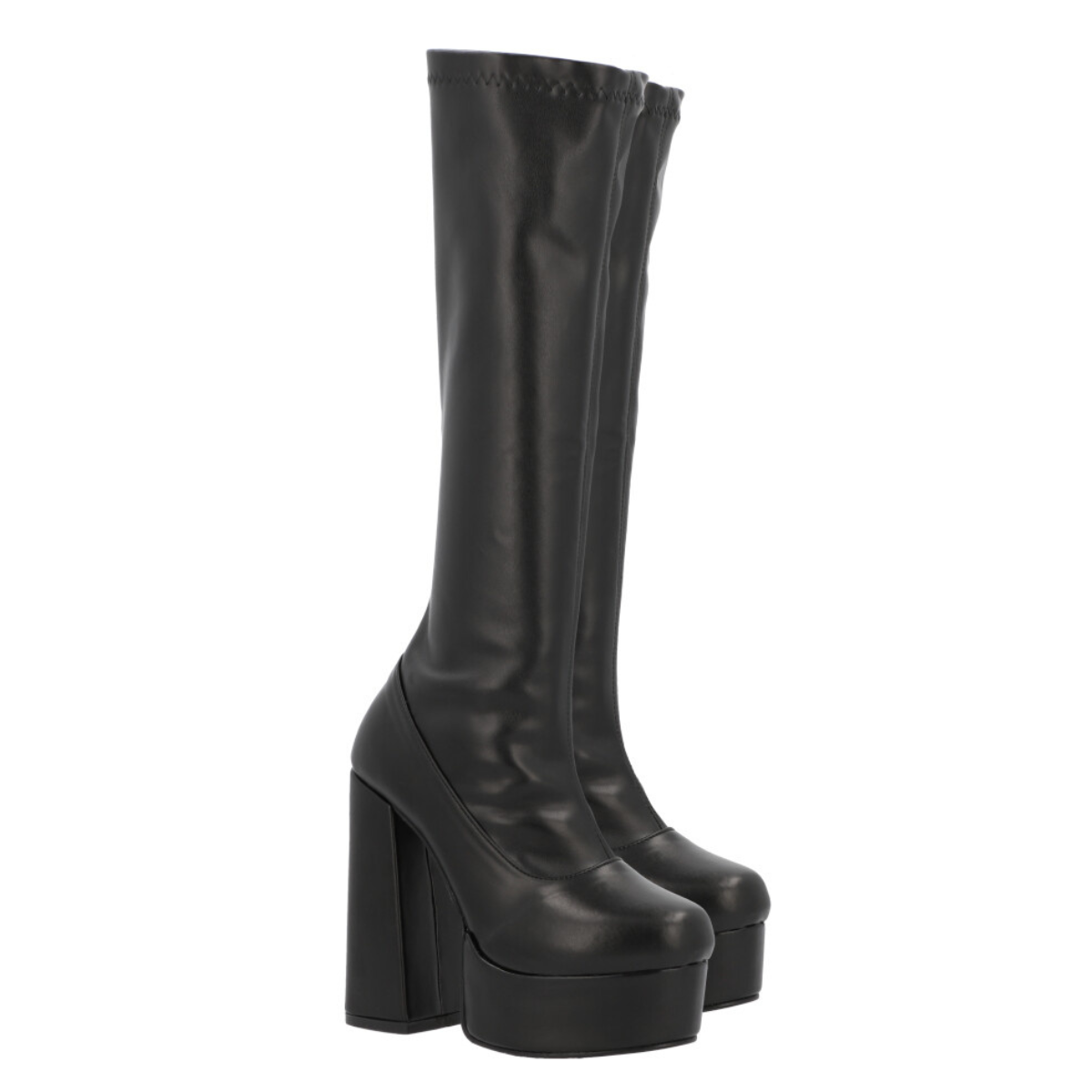Bota larga maxi de plataforma de lycra piel sintética con tacón grueso para mujer con ajuste slim lycra y cierre reforzado.