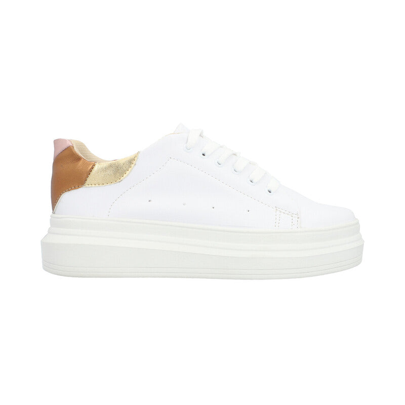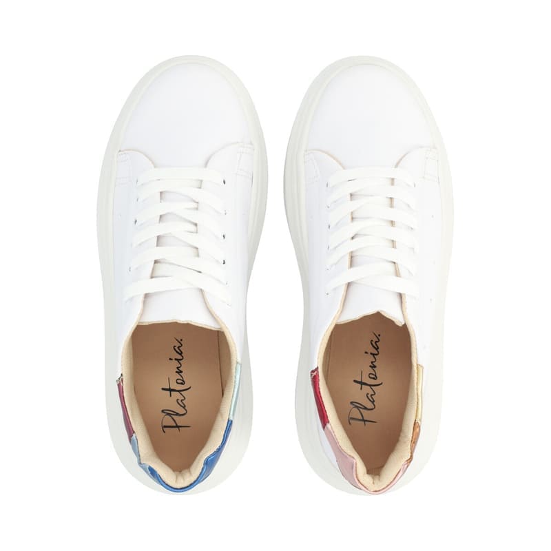 Tenis casual para mujer color blanco con diseño en talón de color multicolor y plataforma exagerada con característica de doble altura