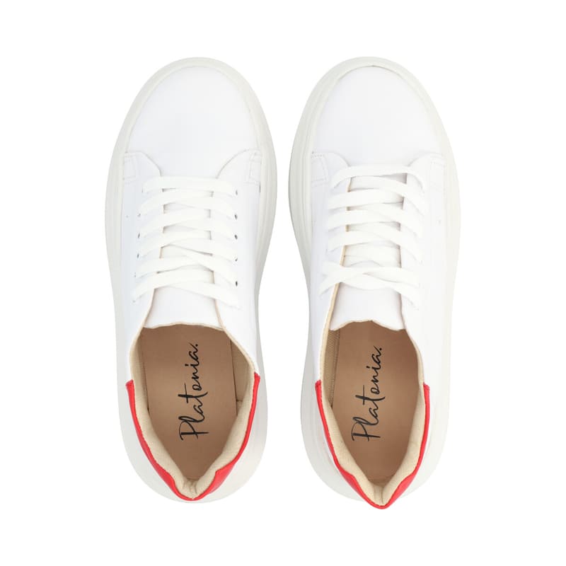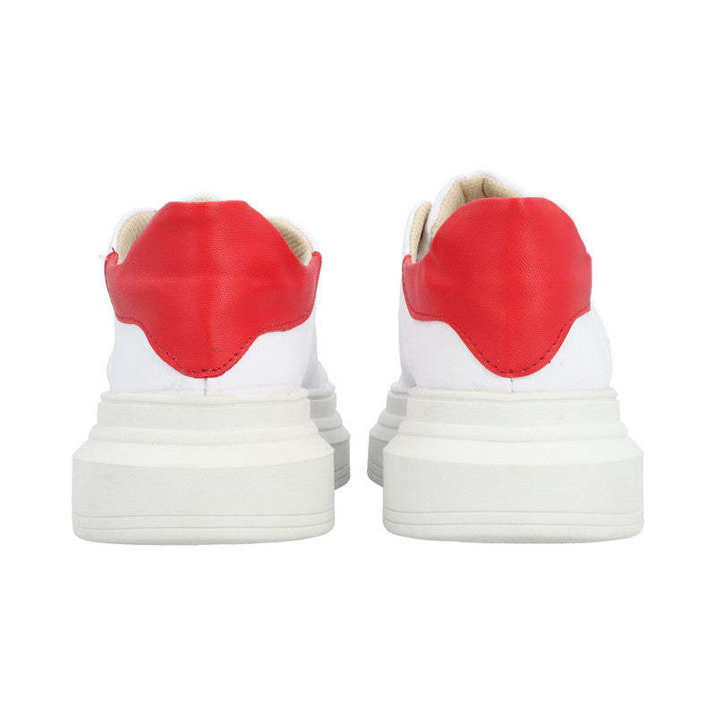 Tenis casual para mujer color blanco con diseño en talón de color rojo y plataforma exagerada con característica de doble altura
